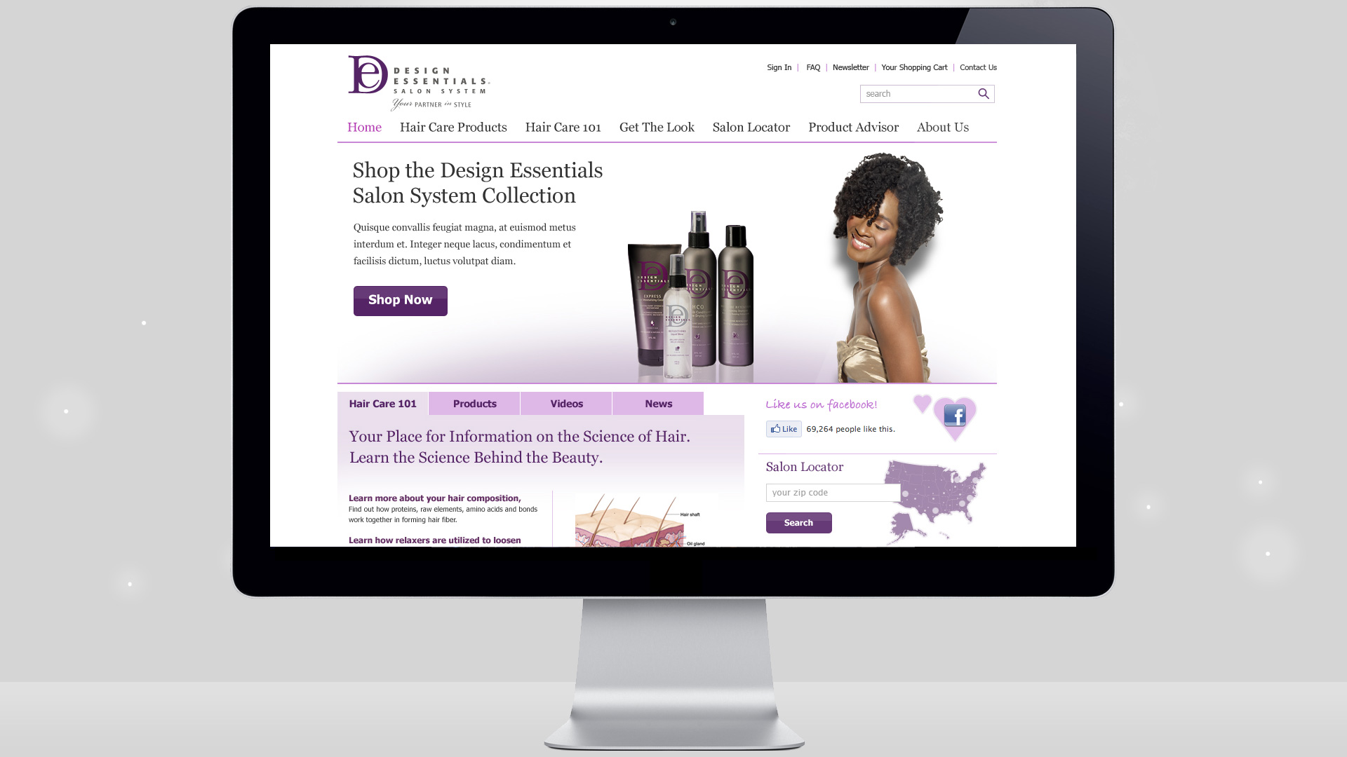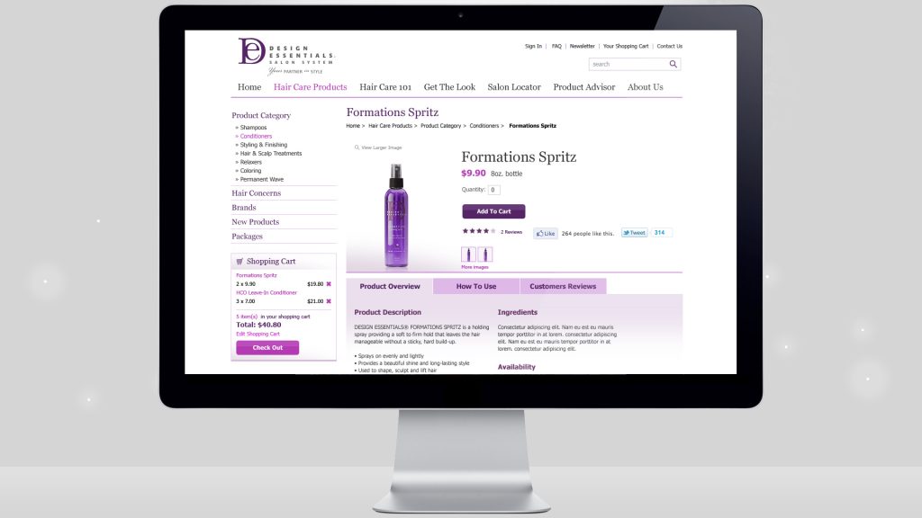 Design Essentials offers quality hair care solutions with a focus on customer education for better results at home or in the salon. This website illustrates the company’s philosophy by combining elegant design with detailed product descriptions.